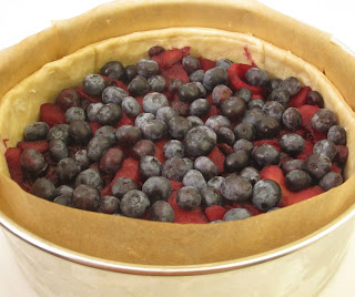 Pour fruit mixture into pan. Spread remaining blueberries across top of fruit. Sprinkle crumble topping across top of pie, gently press edges of crust down with fingertips to meet top of pie and stick the whole thing in the oven. I like to bake pies with a baking sheet on the rack below in case it decides to drip, then you don't have to scrub nasty baked on stuff off the bottom of your oven. Ew.